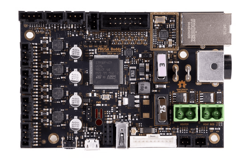 More power, more options. Our brand new custom-made 32-bit “Buddy” motherboard with Trinamic 2209 drivers brings more bang for your buck. It runs Input Shaper and Pressure Advance natively without the need for an additional motherboard, and it also ensures full integration with our highly capable remote print management system, Prusa Connect.